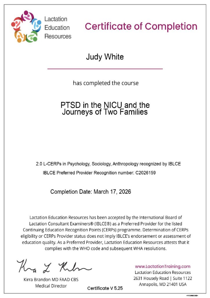 Over the course of my career, I have taken many continuing education classes and webinars. My interests lean strongly toward NICU support for families (I had a NICU kid), birth disparities for women of color, and respectful support for people growing their families through surrogacy, adoption, and IVF. I want to be considered an Ally, and thought of as someone who provides support with sensitive, respectful and continuous care.