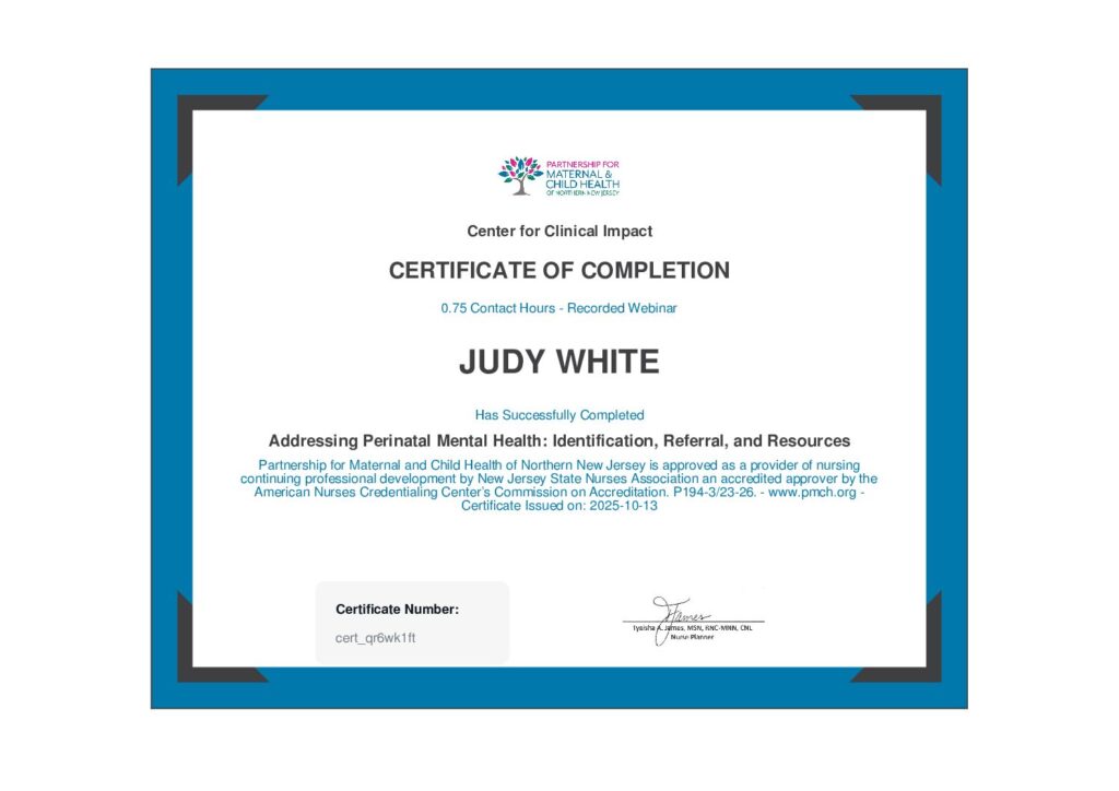 In 2023, The Healthy Children Project course allowed me to sit for my Certified Lactation Counselor, which I passed in the Spring. To learn more about this training, read about Healthy Children Project CLC Training Here.This certification allows me to support successful breastfeeding for my doula clients, staying in my scope with this added service. I do not charge extra for this service for my birth and postpartum clients. Clients in Wyckoff, Franklin Lakes and Oakland may take advantage of an in-home consult for a reasonable fee.